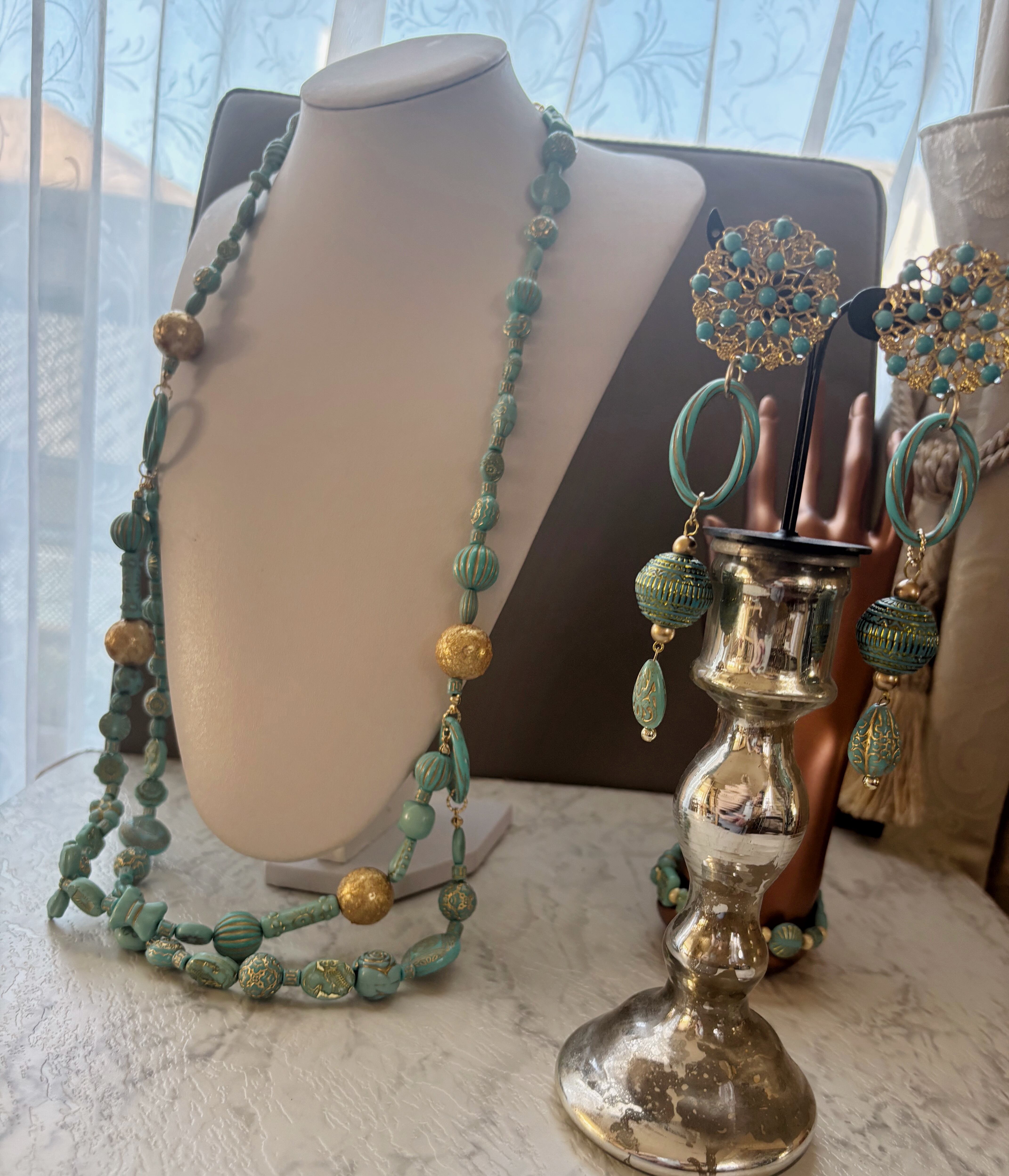 ネックレスは一連の中にさまざまなビーズが組み合わさり、まるで万華鏡のような美しさ。