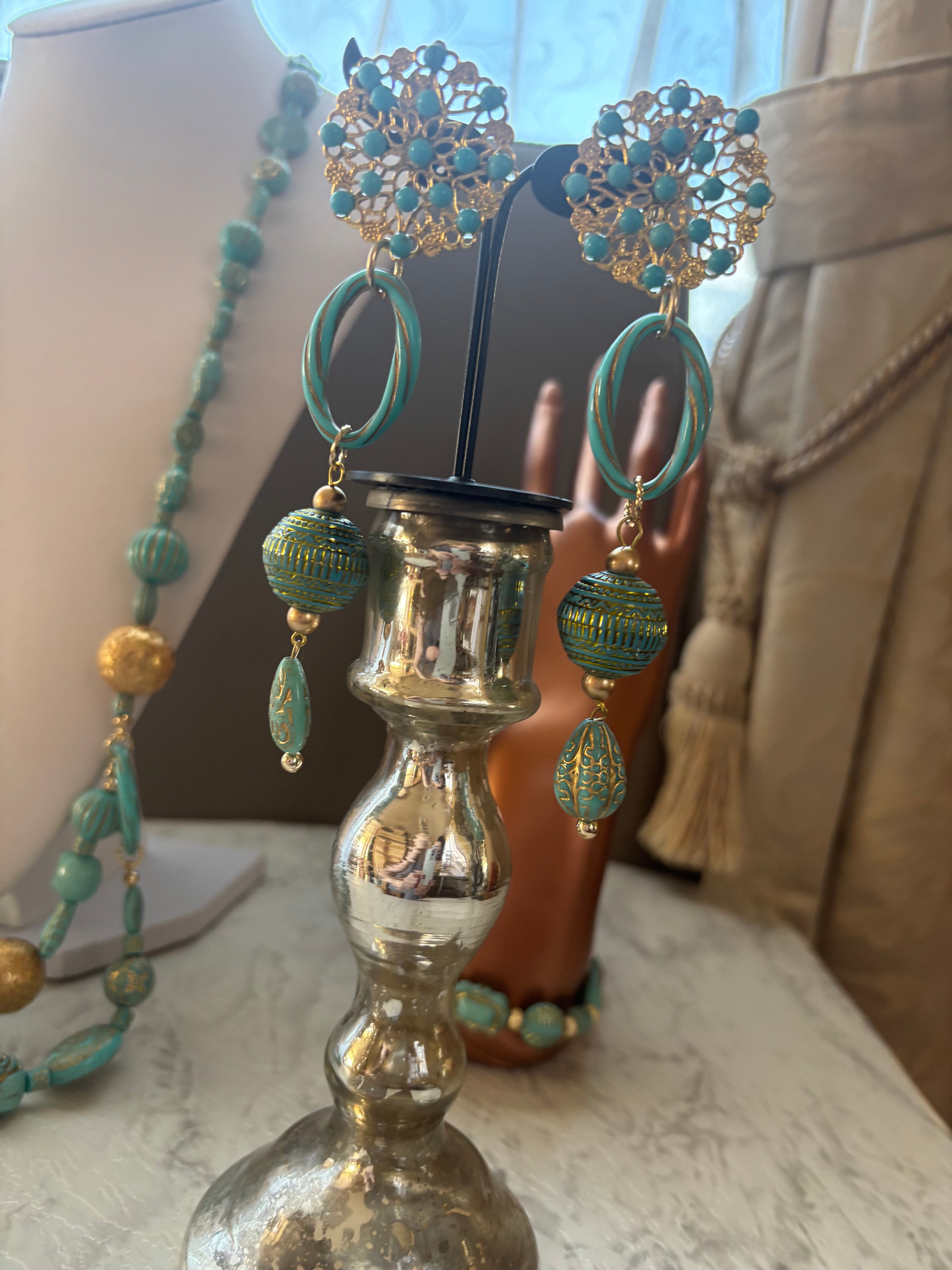 ターコイズブルーのビーズに、金彩がさりげなく光を受けて煌めくデザイン。