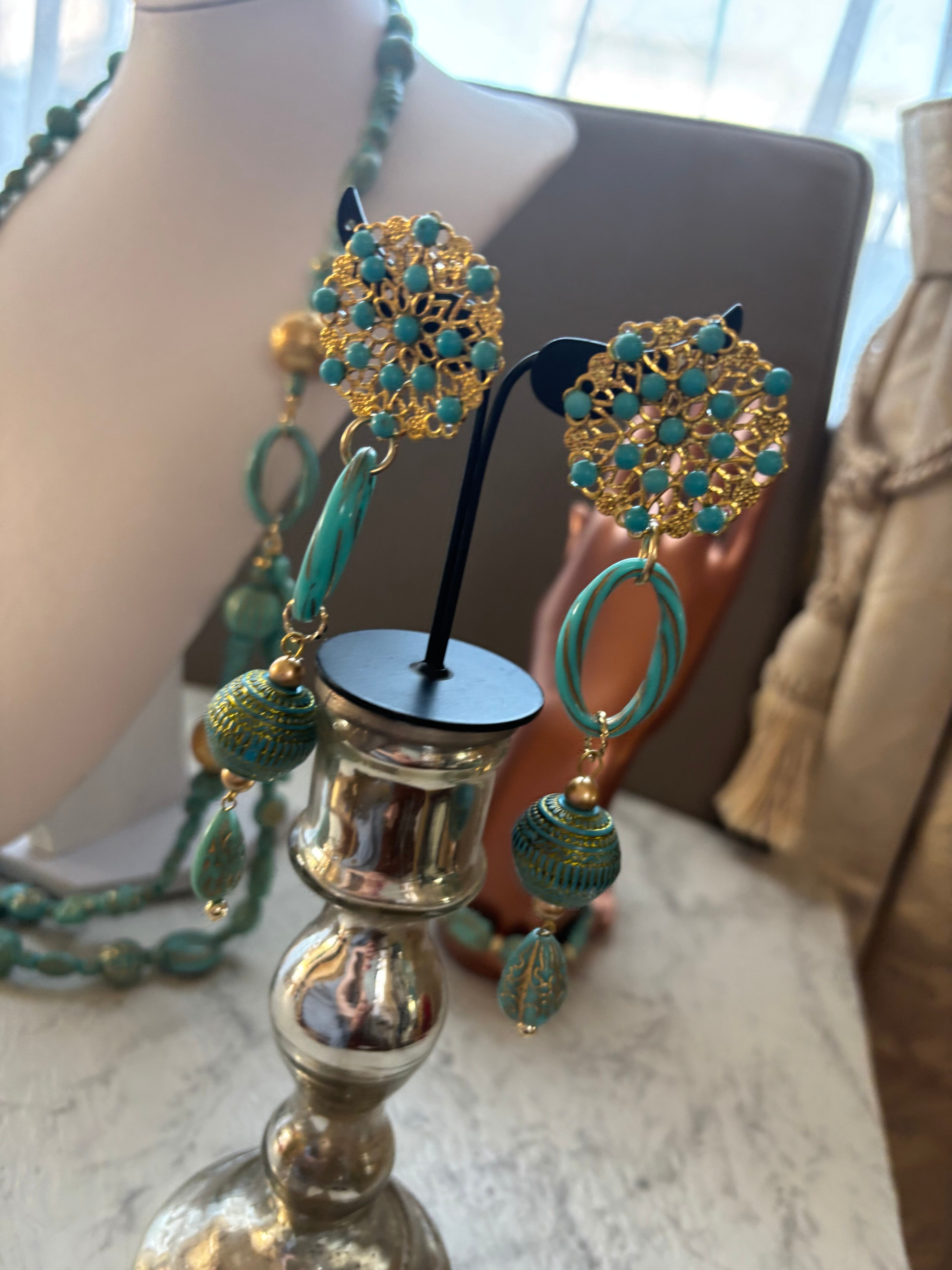 ターコイズブルーのビーズに、金彩がさりげなく光を受けて煌めくデザイン。