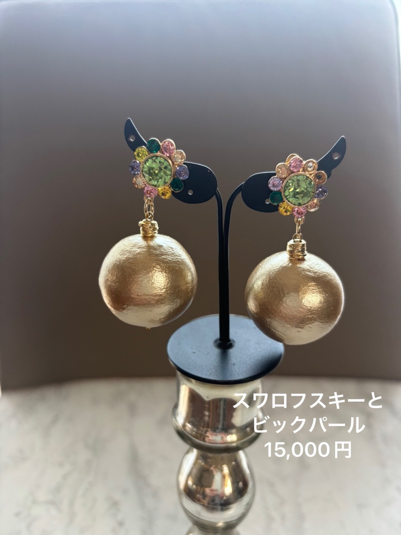 色とりどりのスワロフスキーのお花が、耳元で煌めきます。シックなシャンパンゴールドのコットンパール(直径30mm)と組み合わせることで、エレガントでありながらも親しみやすい印象を与えてくれます。